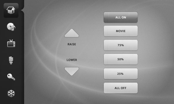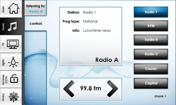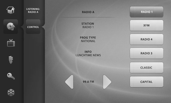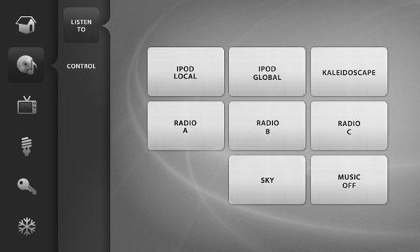 Development of visuals to reskin a touchscreen app user interface, controlling various aspects of a hotel room/villa (climate control, TV, radio, intercom etc) at an exclusive development. I was only able to change the appearance of each button – not the position – so needed to find a solution that created a sense of visual hierarchy from the previous mess of buttons. The final image in the comps below shows a ‘before’ screen.